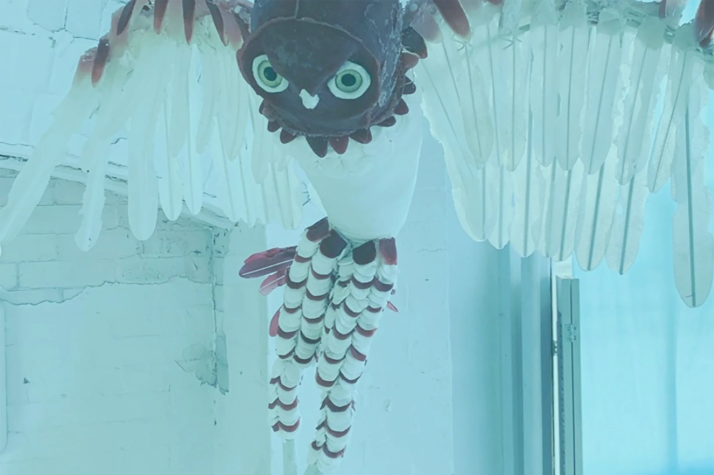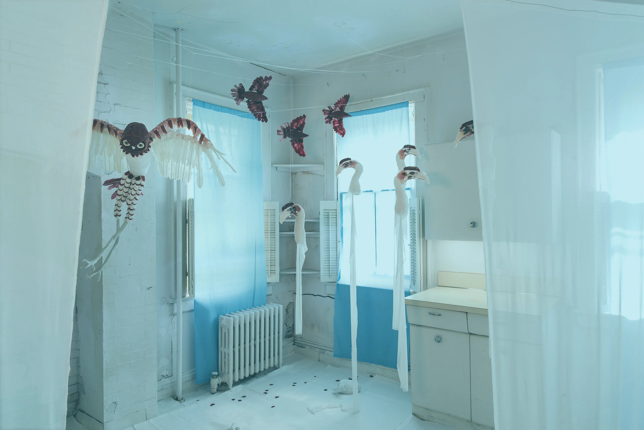 Site-specific installation comprised of the interactions between three works: Megafauna: Cuban Cursorial Owl, 2019; Bloodbirds, 2019; and Vulnerable, 2018. Two of these pieces were made in the exhibition space during an artist residency on Governors Island.